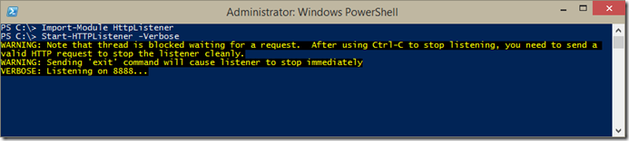 一旦你安裝了這個組件(只需要拷貝它到Documents\WindowsPowerShell\Modules 文件夾),并且導入,你就可以通過Start-HTTPListener啟動一個實例。