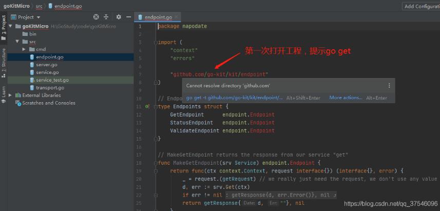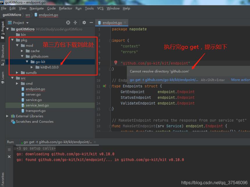 在*.go程序的import()代碼片段中將報紅的依賴項選中并點擊go get...,執行下載安裝操作