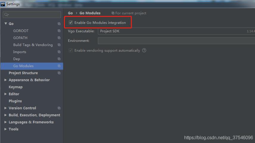在File->Setting->Go Modules設置項中,選中enable go modulse integration