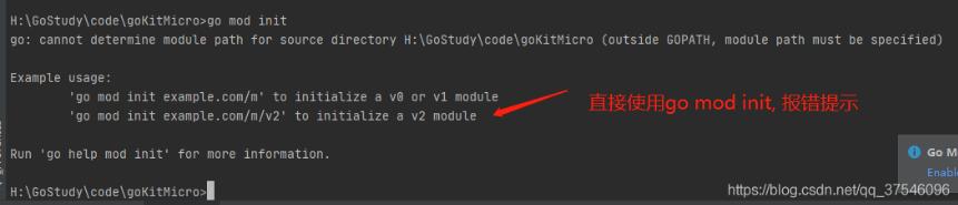 上述報錯的原因是我們的項目文件不遵循GOPATH路徑,因此需要使用go mod init 項目目錄名進行初始化: