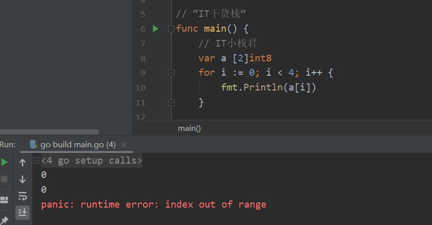 但是在go語言中并沒有方法來進行增刪改查值,只有通過下標的方式,所以我們如果進行了越界處理編譯都會進行報錯。所以才入門的小伙伴們需要注意一下哦。數組的下標在數組的合法范圍之外就會出發訪問越界,會有panic出現。所以小棧君也是通過了一個實例給大家說明一下,因為編譯可能會不通過,所以我們巧妙的避開編譯器的編譯進行數組的越界操作說明。