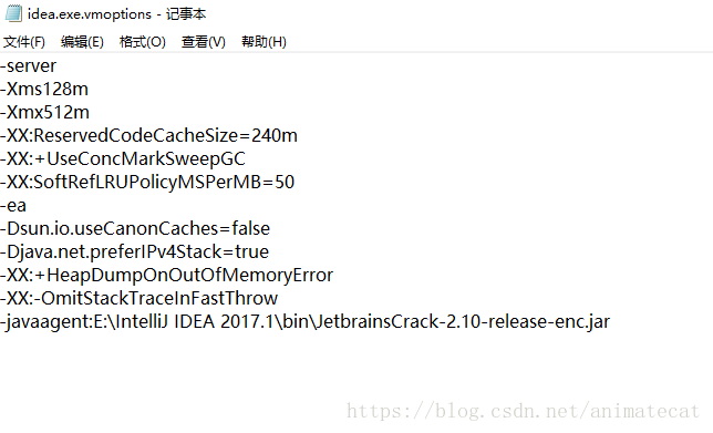4。將這兩個文件用記事本或者寫字板打開,在兩個文件最后一行添加:-javaagent:E:\IntelliJ IDEA 2017.1\bin\JetbrainsCrack-2.10-release-enc.jar。