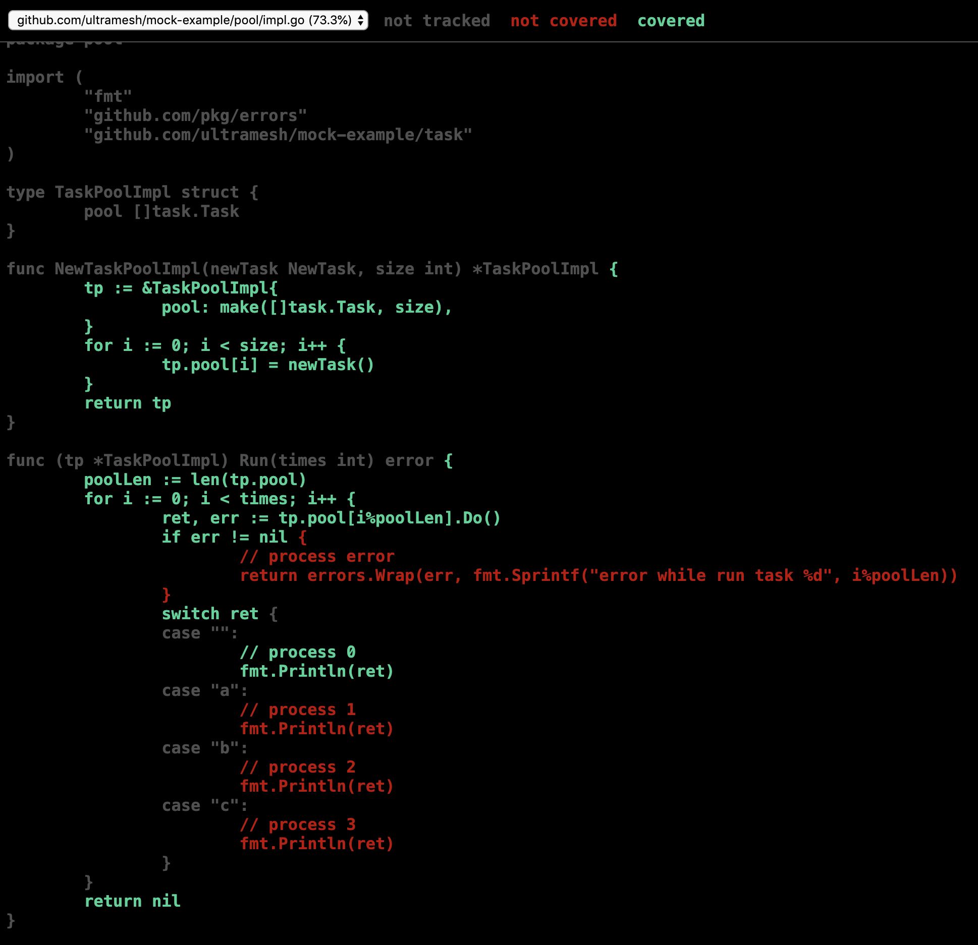 這樣通過go test自帶的覆蓋率測試我們能看到TaskPoolImpl實際被測試到的路徑為
