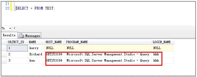 那么我們接下來(lái)在表上面新增幾個(gè)字段 [HOST_NAME]、[PROGRAM_NAME]、LOGIN_NAME用來(lái)記錄最后一次修改該記錄的會(huì)話(huà)信息,另外創(chuàng)建觸發(fā)器TRG_TEST來(lái)更新這幾個(gè)字段
