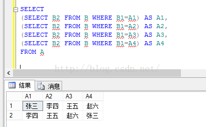 SELECT (SELECT B2 FROM B WHERE B1=A1) AS A1, (SELECT B2 FROM B WHERE B1=A2) AS A2, (SELECT B2 FROM B WHERE B1=A3) AS A3, (SELECT B2 FROM B WHERE B1=A4) AS A4 FROM A