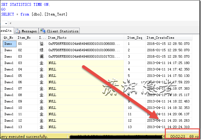 這個表有13800KB(也就是13M多大小),因為該表將圖片保存到數據庫(Item_Photo字段為iamge類型),這個是歷史原因,暫且不噴這種的設計。看來這個SQL執行時間長的性能問題不在于IO和SQL本身執行計劃是否有問題,而是在網絡數據傳時間上(服務器與客戶端位于異地,兩地專線帶寬6M,不過很多應用、郵件、系統都依賴此專線)