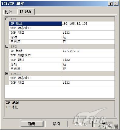 首先,最常用最常見(jiàn)的就是1433端口。這個(gè)是數(shù)據(jù)庫(kù)引擎的端口,如果我們要遠(yuǎn)程連接數(shù)據(jù)庫(kù)引擎,那么就需要打開(kāi)該端口。這個(gè)端口是可以修改的,在“SQL Server配置管理器”中切換到“XXX的協(xié)議”里面選擇,TCP/IP協(xié)議屬性中可以設(shè)置TCP端口。如圖所示: