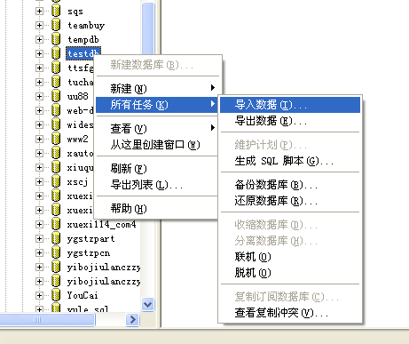 4、進入后,選擇到您的數據庫,如testdb。在上面點右鍵,"所有任務">>"導入數據",如圖4。