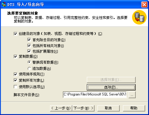 8、這一步可以把"包括擴展屬性"和"排序規則"兩個選擇上。接著去掉左下的"使用默認選項",點擊右下角的"選項"來進行配置。