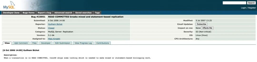 比如,在MySQL官網上,有人就給官方曾經提過一個相關的Bug
