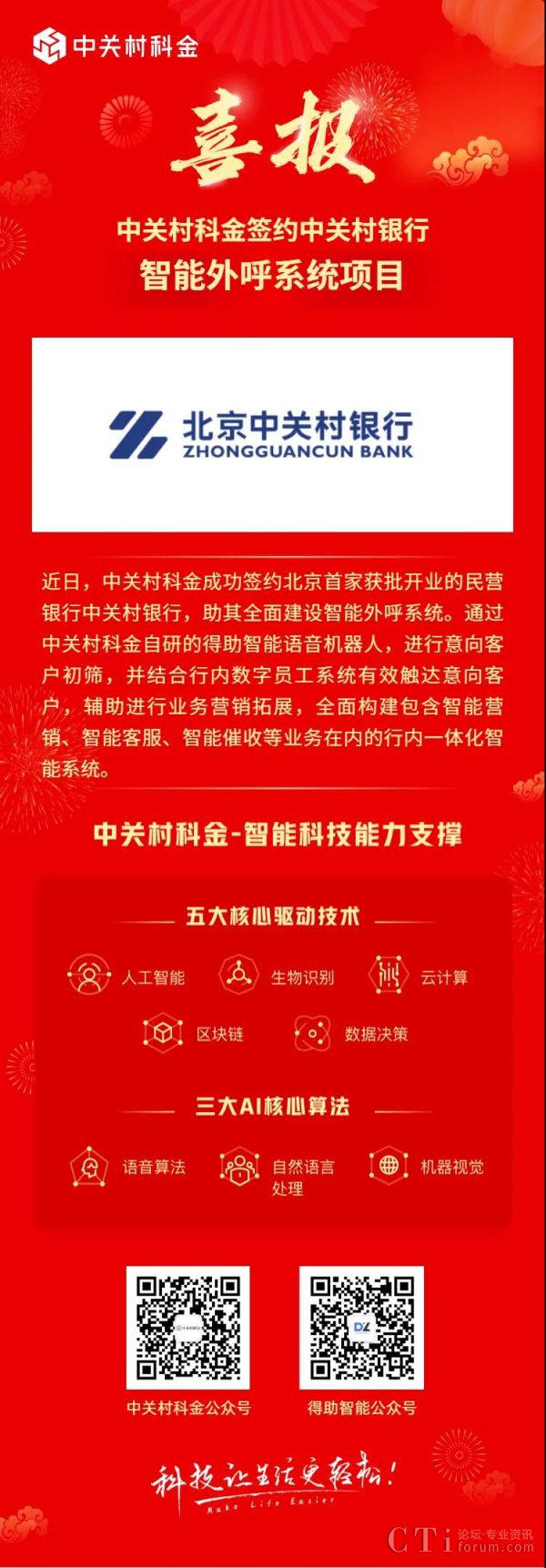 近日,中關村科金成功簽約北京中關村銀行,助其全面建設智能外呼系統。