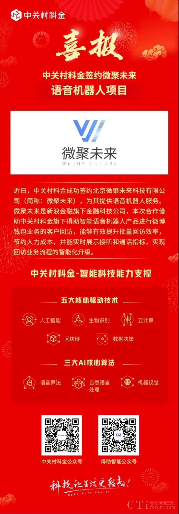 近日,中關(guān)村科金成功簽約微聚未來,為其提供語音機(jī)器人服務(wù)。