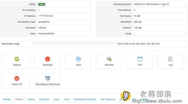 如果我們有用過SolusVM面板就顯得很簡單(文章最后會附詳細說明),因為小編這里選擇的是128MB內存方案,使用最多的估計就是重裝系統、重置ROOT密碼之類的,如果我們購買KVM架構512MB以及以上方案,默認還有Windows系統OS,還可以安裝Windows系統。