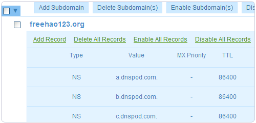 5、然后到DNS管理后臺設置A、CNAME、TXT等解析記錄了,這里用的是DNSPOD國際版。