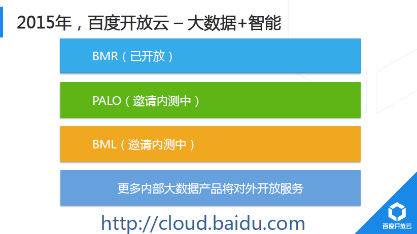 最后,向大家簡要介紹百度開放云。2014年,百度正式?jīng)Q定將服務(wù)內(nèi)部業(yè)務(wù)多年的云計(jì)算技術(shù)正式對外提供服務(wù),即百度開放云,對應(yīng)官網(wǎng)http://cloud.baidu.com。百度開放云大數(shù)據(jù)方面,BMR已經(jīng)對外開放,而更多的大數(shù)據(jù)分析和服務(wù)都還未對外開放。BMR集群上可以做到按需部署,用戶專享,更關(guān)鍵的是完全兼容開源的Hadoop/Spark平臺,開放云客戶基于Hadoop、Spark、Hbase等已經(jīng)實(shí)現(xiàn)的大數(shù)據(jù)業(yè)務(wù)幾乎不用修改就可以平滑遷移到云上。多維分析服務(wù)Palo,它完全兼容MySQL網(wǎng)絡(luò)協(xié)議,因此,客戶朋友們熟悉的Mysql Client的工具均可使用。