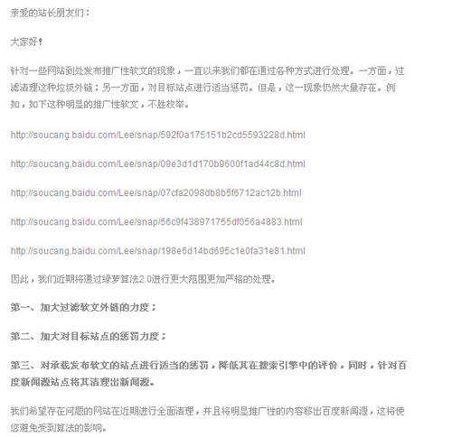 另外,關于外鏈的質量,可能直到現在,很多朋友都會把網站的權重當做是最重要因素,雖然知道外鏈要考慮相關度,但是在今天這樣的大環境下,相關度的重要性在很多朋友眼中都是低于鏈接承載網站的權重的。今天百度綠蘿2.0的公告,就是告訴你,不要只看平臺的權重,寶寶樹高不高?網易高不高?大型新聞源又怎么樣?在百度眼中,新聞源只是比個人的草根站點稍微牛一點,但本質上都是一樣要依賴百度。看你不爽一樣懲罰!