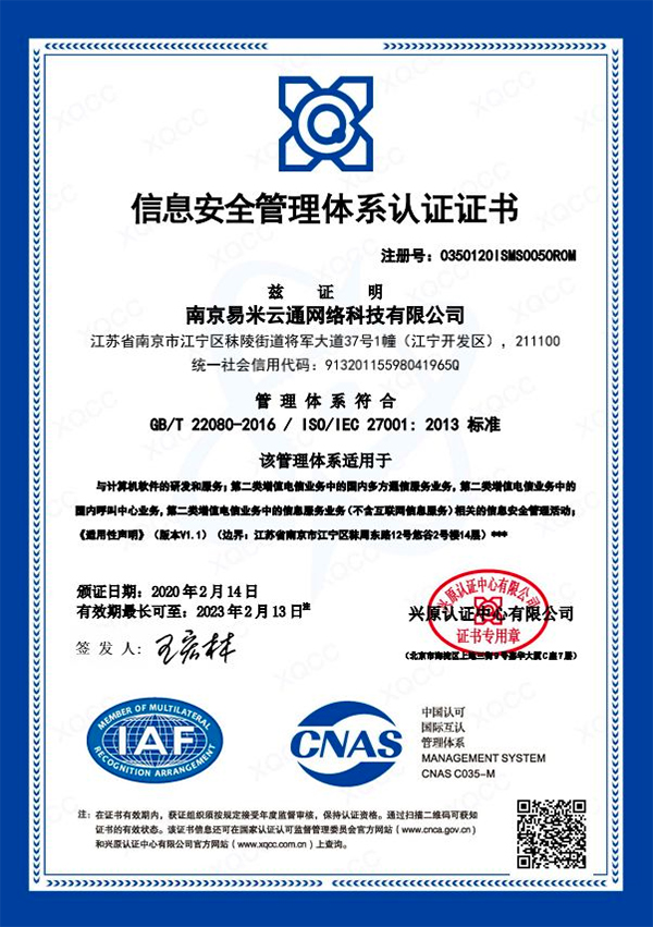 近日,易米云通ISO27001信息安全管理體系認證證書獲得審批。未來,易米云通愿用更加先進高效的AI智能語音技術產品和服務,在抗擊疫情的關鍵時期,為更多政府機構提供快速響應和鼎力支持。