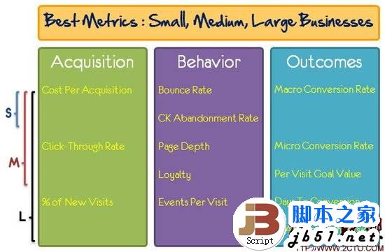對于中型網站需關注以上9個度量,如果有天我們能獲得超過500萬美金的經濟收益時,就說明它們見效了。它們與小型站點度量不同之處的關鍵在于,我們需要致力于多重轉化、深層次的網站交互以及更好的營收效率分析。