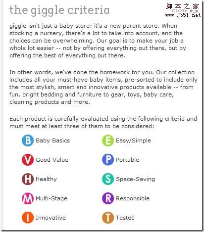 圖四:“the giggle criteria”用10個不同顏色的字母圖標來為每一件商品打上易讀的標簽,強調自己出售的兒童商品已經是由內部專家團隊特別為家長們按照最嚴格標準篩選出來的,可以放心購買。