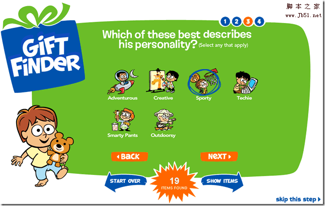 圖六:ToysRUs.com的禮物檢索器,1-2步分別是選擇性別和年齡,在第三步 列出了6種不同孩子的性格,并且會根據點選結果自動更新合適的商品數量