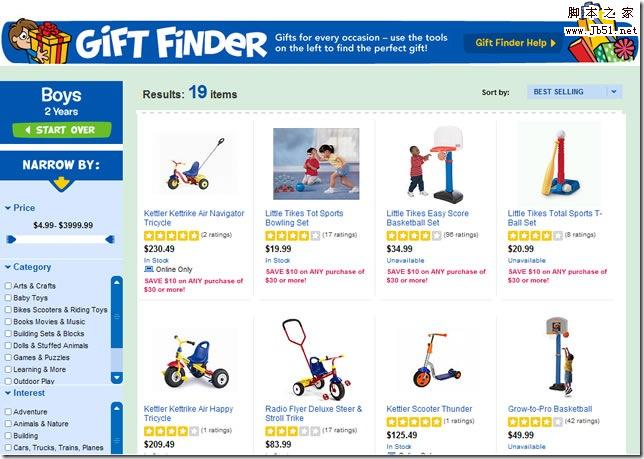 ToysRUs.com則為給兒童挑選禮品的購物者專門做了一個圖形化的檢索工具,只要通過四步簡單的選擇就能為不同類型(甚至包括性格上是更偏創意型或者更偏運動型)的孩子們找到合適的商品。