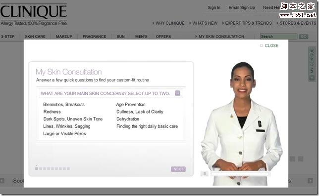 每一個購物者都是獨特的,一些我們的零售百強網站在定制個性化購物體驗上做了很好的嘗試。除了幫助用戶記錄他上次瀏覽過的商品或者根據IP地址判斷其所在國家這些常規功能外,例如在Clinique.com,購物者可以通過做一個10步驟的調查來找出最合適自己個性需求的護膚產品。每一步的調查中還有倩碧的專業保養咨詢師協助指導(動畫),這些咨詢師的形象當然會根據區域的不同而進行定制。
