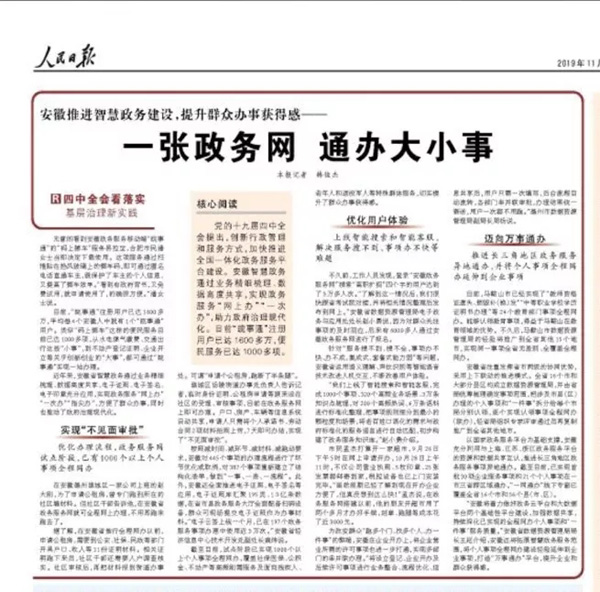 11月20日,《人民日報》以《一張政務網通辦大小事(四中全會看落實·基層治理新實踐)》為題,大篇幅報道了安徽智慧政務建設成果,并對安徽智慧政務給予了高度肯定,報道稱:“安徽省智慧政務通過業務精細梳理、數據高度共享,技術充分應用,實現政務服務“網上辦”“一次辦”“指尖辦”,方便了群眾辦事,同時也推動了政府治理現代化。”