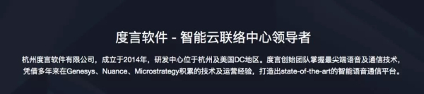 杭州度言軟件有限公司,成立于2014年,研發(fā)中心位于杭州及美國(guó)DC地區(qū)。度言創(chuàng)始團(tuán)隊(duì)掌握最尖端語(yǔ)音及通信技術(shù),憑借多年來(lái)在Genesys、Nuance、Microstrategy積累的技術(shù)及運(yùn)營(yíng)經(jīng)驗(yàn),打造出state-of-the-art的智能語(yǔ)音通信平臺(tái)。