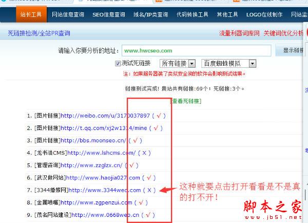 死鏈接指的就是失效的鏈接、錯誤鏈接,它原本是正常的,但是后來就變成無效的鏈接,使得網頁中打開這個死鏈接地址,服務器回應的就是打不開的頁面或友好的404錯誤頁面。避免死鏈接是做好站內優化很重要的環節。要快速發現我們的網站是否有死鏈接,我們可以通過站長工具來查詢!查出來的死鏈接,再直接打開進行進一步確認!如下圖: