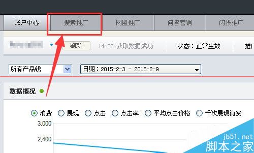 3、完成百度競價賬號登陸之后,會來到百度賬戶中心頁面,再點擊左上角主菜單欄中的“搜索推廣”菜單。(如下圖)