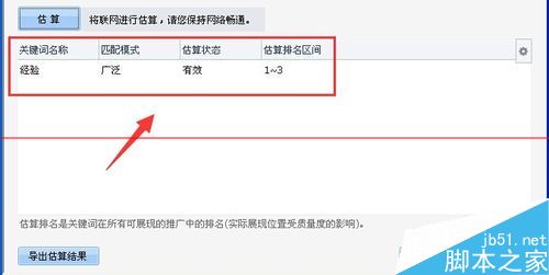 6、然后就可以看到在這個出價的前提下,投放關鍵詞的排名情況,當然這是廣泛匹配模式下的估算排名,想要查看短語匹配或者精確匹配下的排名的話,可以重新在上面關鍵詞輸入欄中給投放關鍵詞添加“”符號或者[ ]符號,來進行短語匹配或精確匹配下的估算排名情況。(如下圖)