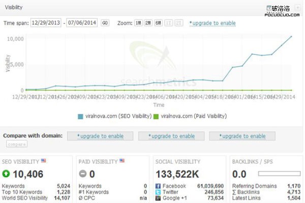 最近看到一個國外viralnova網站,真牛。去年5月上線,沒過幾個月,每天就有200多萬的獨立訪問用戶,得到用戶認可,月收入幾十萬美金。Alexa世界排名很快就進入幾百強,而且現在該網站的SEOVisibility值已經上升到10406,并且保持良好的上升趨勢,如下圖: