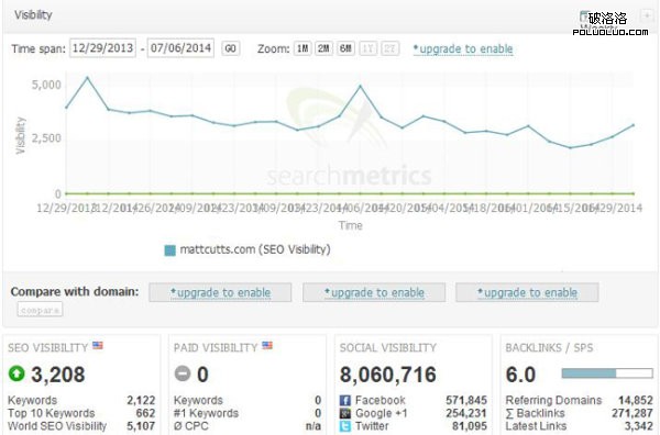 可能光看一個,沒有對比,看不出什么。我干脆把谷歌反垃圾團隊老大MattCutts的博客拿來對比一下,Matt還是非常受歡迎的。和Matt Cutts博客的SEOVisibility值相比,viralnova網站短短幾個月就是他的差不多3倍了。