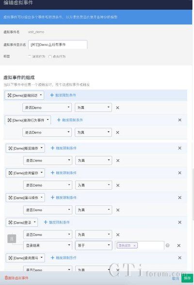 以神策分析自身的產(chǎn)品為例,神策分析非常關注用戶在Demo上,“行為事件分析功能”、“漏斗分析功能”、“留存分析功能”、“回訪分析功能”、“概覽操作”等核心功能的使用情況,于是創(chuàng)建一條虛擬事件,如圖8所示。創(chuàng)建好后,通過后端API采集的方式將該條事件的計算結果(總查詢次數(shù))傳入CRM,從而輔助銷售團隊去查看產(chǎn)品試用情況、快速判斷用戶需求和銷售切入點。