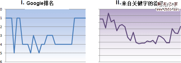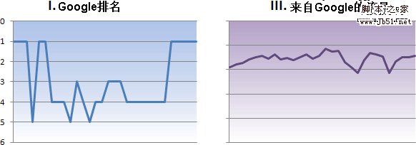 按大多數SEO的觀點來看,客戶最重要的關鍵字的排名會怎樣影響他們的網站的中的搜索流量呢?我再把這個關鍵字排名的走勢圖放在下面(圖I),另外加上一個來自Google的非付費的7個月的周搜索流量作為比較(圖III)。