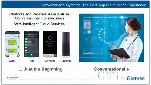 David W.Cearly表示:小i機(jī)器人、Siri、Cortana等通過聊天機(jī)器人(ChatBots)或者個(gè)人助理(Personal Assistants)將云端的智能交互能力展現(xiàn)出來,而這種來自云端的交互能力,可以以虛擬的方式呈現(xiàn),也可以對(duì)接至一切硬件終端,而連接用戶和應(yīng)用的就是一個(gè)對(duì)話式用戶界面(CUI)。