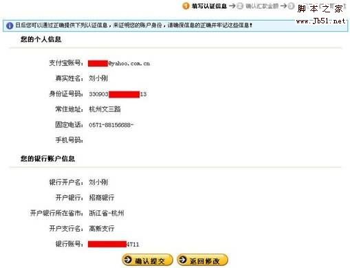 注意:在提交認(rèn)證資料后,請立即查看您的銀行卡余額并記下它,然后在1-2個(gè)工作日內(nèi)到銀行柜臺、ATM取款機(jī)、電話銀行或網(wǎng)上銀行查詢,多出的金額就是支付寶給您匯的確認(rèn)資金。
