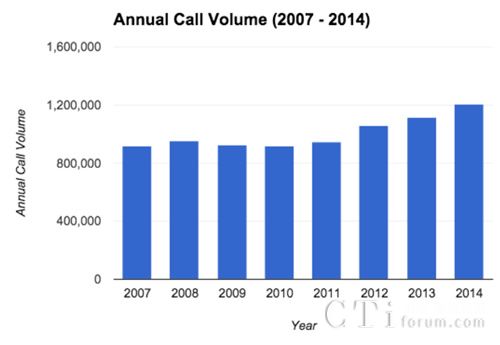 從2007年開始,呼叫中心每年接到的報警電話在90萬次左右,有些年份還有降低,但是從2011年開始,報警電話的數量開始持續增長。2014年,呼叫中心接到了120萬次報警電話,比2011年增長了28%。與此同時,呼叫中心的警員數量并沒有這么大幅度的增長,大家疲于奔命也就很好理解了。