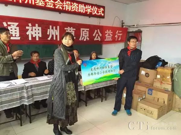 北京信普飛科科技有限公司張萍代表愛通神州助學基金向郝車倌小學捐贈三萬余元的物資。
