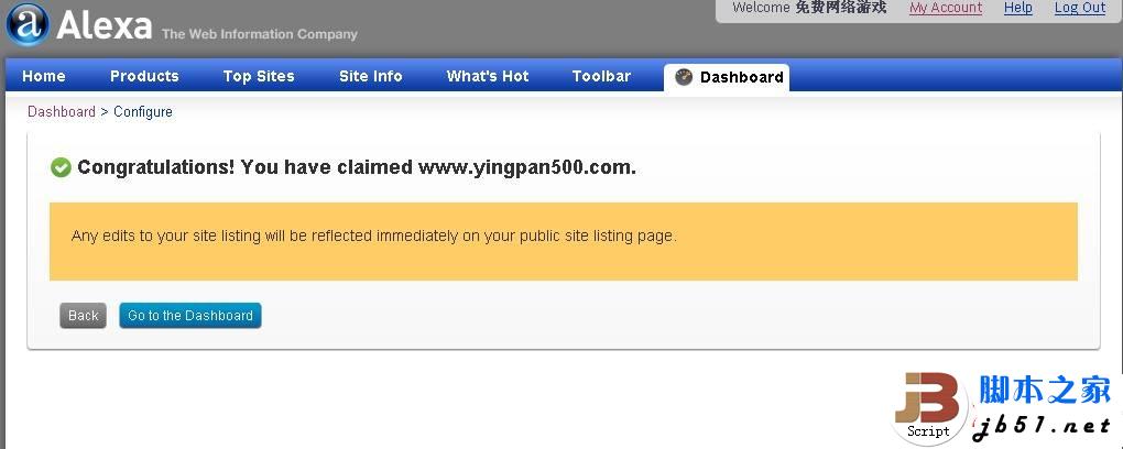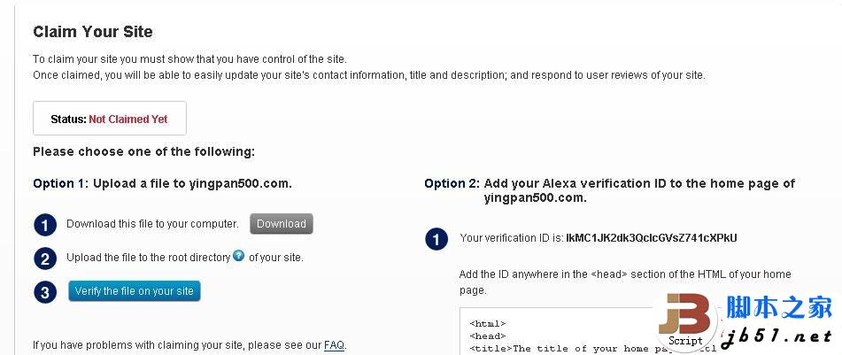 圖3 5、接著圖3來說,圖中的大概意思是說有些功能需要付費,如步驟4我們選擇免費,接下來在下一個頁面上Website URL輸入你的目標URL,然后點擊Continue按鈕繼續(xù); 6、驗證你網(wǎng)站所有權Claim Your Site(和普通的驗證是相似),ALEXA提供了二個驗證方式,一個是下載文件上傳空間,一個是添加代碼。在這里我們就選擇第一個,選擇Download下載 驗證文件,然后上傳到你網(wǎng)站空間,接下來點擊Verify the file on your site按鈕,驗證完成! 如圖4:
