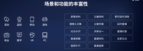 七牛直播云給用戶提供了大量的功能,如數據存儲,云端錄制存儲功能,還有回看,內容增發的網絡,等等功能。 七牛直播云給用戶提供了常見的場景與功能。例如在活動直播中,對應了云端直播的功能,可在云端錄制、延時直播,可以把一段內容推遲播放;例如移動直播中,比較熱門的功能就是連麥互動,內容在持續升級,交互體驗也在升持續級,連麥互動可以進化到觀眾和主播之間,每個人都可以申請一個連麥端加入進來直播中。還有其中游戲、教學、電臺、VR和PC等場景,都提供相應的特殊功能。