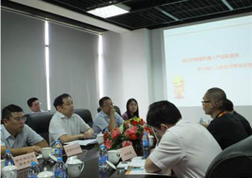 周國雄(左二)一行同小i機器人董事長袁輝、總裁朱頻頻等進行座談