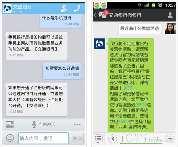 CTI論壇(ctiforum)5月15消息(記者 楊毅):交通銀行及其信用卡中心緊跟移動互聯網應用潮流,在銀行業內率先實現手機銀行語音交互和全媒體渠道地整合,邁出了智慧銀行跨界創新的一步: