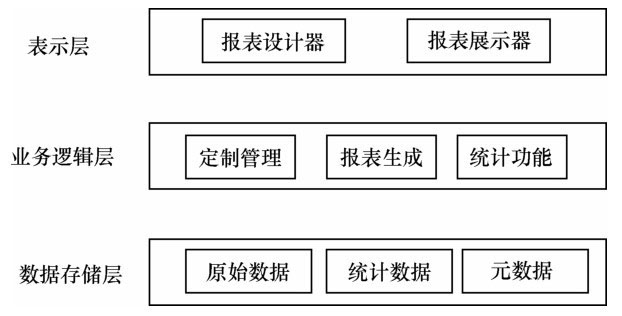 統計報表系統實現了必要的統計報表服務,支持用戶對數據進行瀏覽、分析和輸出等,可以分為表示層、業務邏輯層、數據存儲層,如圖所示: