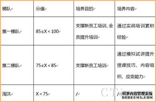 第二梯隊培訓師的考評,以最后一次試講的表現(xiàn)進行評估,達到第一梯隊標準的即可升入第一梯隊進行培養(yǎng)。