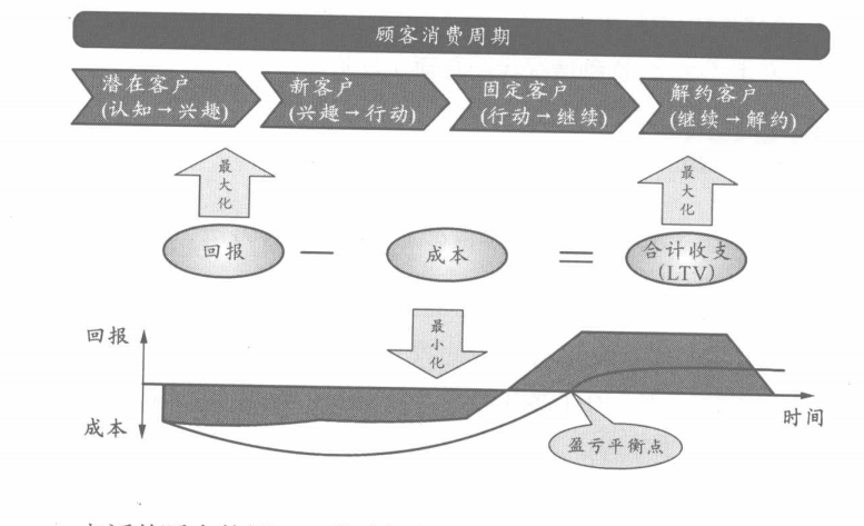 所謂的LTV,就是顧客生涯價值的英文簡稱,是將一個顧客在一定時期內為企業帶來的以及被期望帶來的全部利益用現在的貨幣價值來評價、進行金額換算的指標。一般會用LTV來計算3年左右中長期個人客戶的收益貢獻度。LTV的計算方法是,從收入——一定時期內所能夠期待的收益額(即期待收益額)中,減去支出——獲取顧客所必須花費的費用(即獲取顧客所需成本)以及與顧客維持合同關系的費用(即顧客維持成本),所得的金額。收入所包含的,并不單單是指面向顧客的特定商品的銷售收入,也包含由于升級銷售或者交叉銷售所增加的收入。有時候也包括由于傳播消息或者介紹朋友、家人所得到的收入。