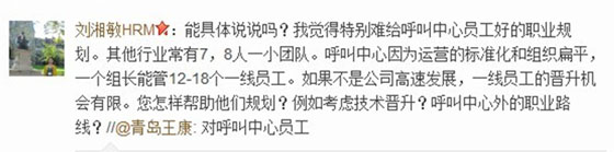 對于劉湘敏博士在微博中提出的問題,每一個呼叫中心的運營管理者都有著自己不同的見解,我所采用的方式是讓員工最大化的進行個性展示,根據他們自身的不同特點給予不同的職業規劃和發展方向的指導。