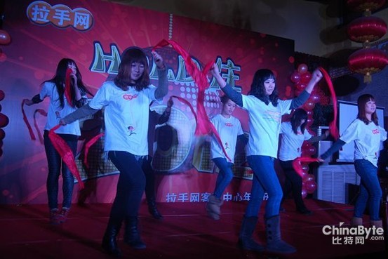 圖:拉手網呼叫中心的美女們在年會上表演舞蹈