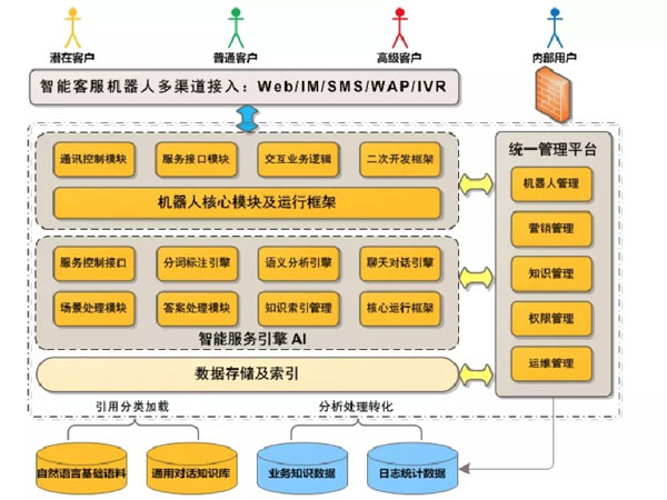 智能服務的流程需要頂層設計,之前提到的打通節點非常關鍵,因為智能服務的絕大部分數據來自于客戶的點擊和輸入,只有流程閉環,才能看清客戶體驗路徑,才有優化的基礎。最佳的實踐是可以將人工服務中的語音、文字聊天和從不同平臺來的智能服務交互都統合起來,在后臺系統中通過客戶信息索引可以查看到客戶在一段時間內的所有服務過程,這樣的數據鏈路是最優的,即便不能達到這種實現,也可以在智能服務的不同入口實現通路。所以在部署規劃的初期,要把智能服務的系統畫入整個系統實現圖中,完成必要的系統對接。