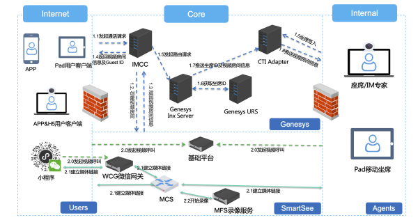 視頻客服系統(tǒng)通過Genesys系統(tǒng),用戶發(fā)起呼叫后進(jìn)行統(tǒng)一路由、統(tǒng)一排隊的呼叫流程。